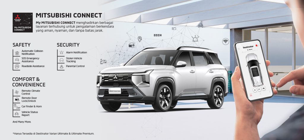 Mitsubishi Connect: Selalu terhubung dengan Mitsubishi Destinator Anda melalui genggaman smartphone. Mitsubishi Connect memberikan pengalaman berkendara yang lebih aman, nyaman, dan terlindungi dengan beragam fitur konektivitas.